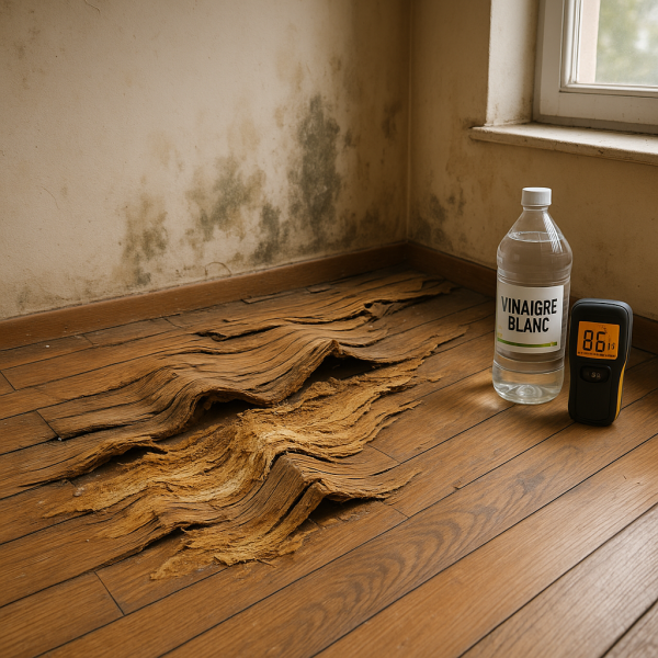 Les signes incluent l'odeur de moisi, des taches d'humidité, des gondolements du bois et la présence de mycélium.