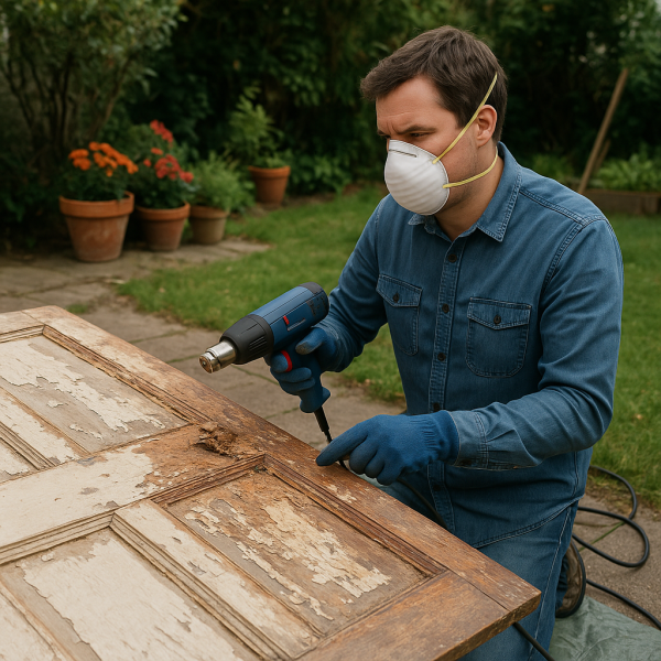 - Pour le décapage thermique : dirigez la chaleur sur la peinture en gardant le décapeur à une distance appropriée pour éviter les brûlures.