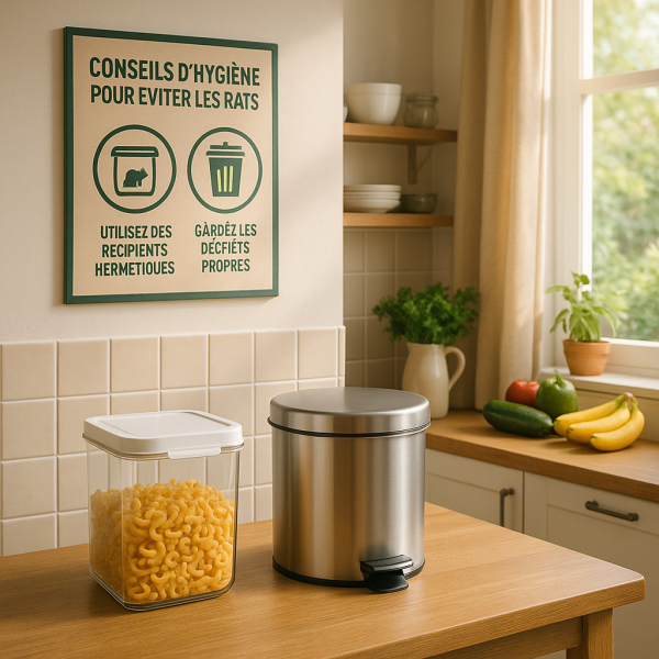 Gardez vos poubelles fermées et nettoyez régulièrement. Des déchets laissés à l'air libre peuvent attirer les rats. Assurez-vous de ne pas laisser de débris alimentaires dans votre cuisine.
