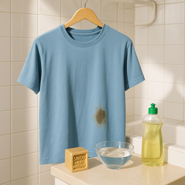Les détergents naturels comme le savon de Marseille ou le liquide vaisselle sont également très efficaces. Pour le savon de Marseille, frottez directement la tache avec un peu d'eau tiède. Pour le liquide vaisselle, appliquez-le à la main sur la tache et laissez agir quelques minutes avant de rincer.